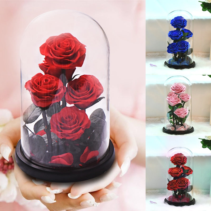 Conservée dans un Dôme de Verre avec 5 Têtes de Fleurs ou 3 Têtes de Fleurs ou une Rose Seulement Accompagné à la Base de Véritable Pétales.